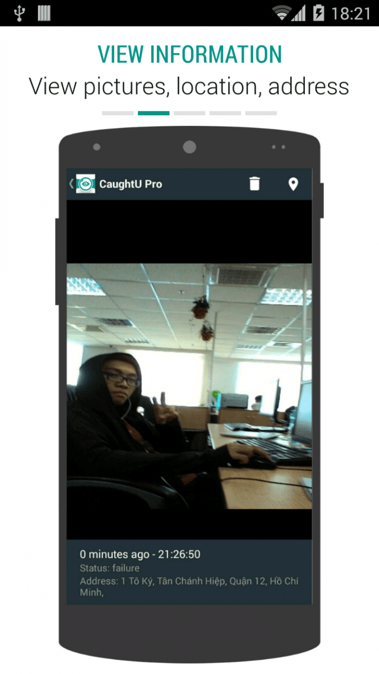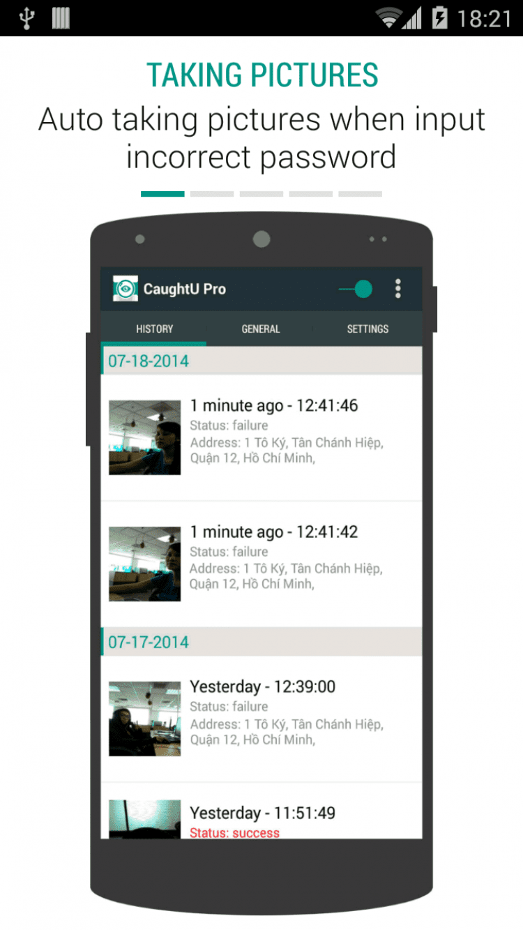 CaughtU Pro - Caught You — это приложение позволит вам узнавать, кто использовал ваше мобильное устройство, пока вы не видели. При неверном вводе пароля, приложение CaughtU активирует фронтальную камеру и GPS-модуль вашего устройства, а затем отправит вам фотографию и местоположение пользователя по электронной почте. Приложение CaughtU позволит вам выбрать количество попыток неправильного ввода пароля (2,3 или 4), позволяет сохранять фотографии злоумышленника и его местоположение внутри приложения или на Google Диск, отображать заданное сообщение при неправильном вводе пароля, а так же автоматически включать интернет-соединение для отправки данных.
