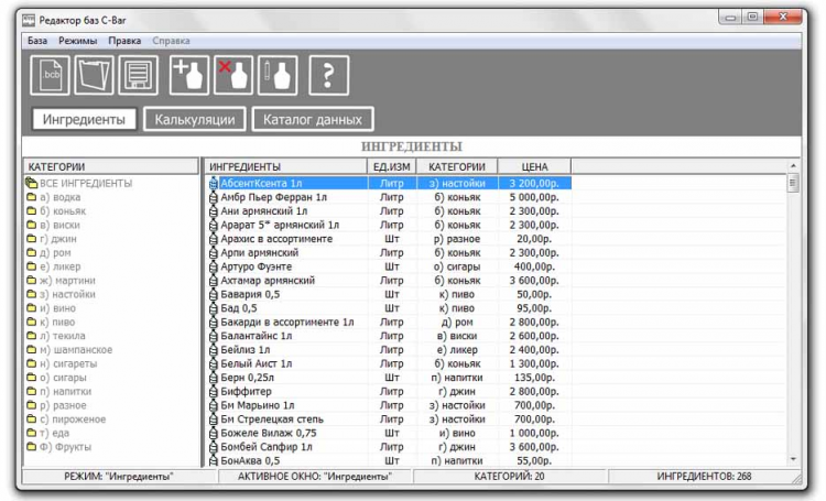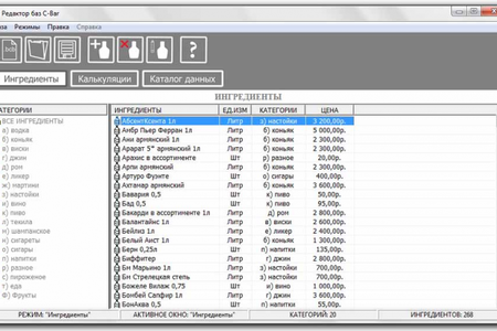 • cоздание базы данных бара (ингредиенты, калькуляции, и каталог калькуляций);