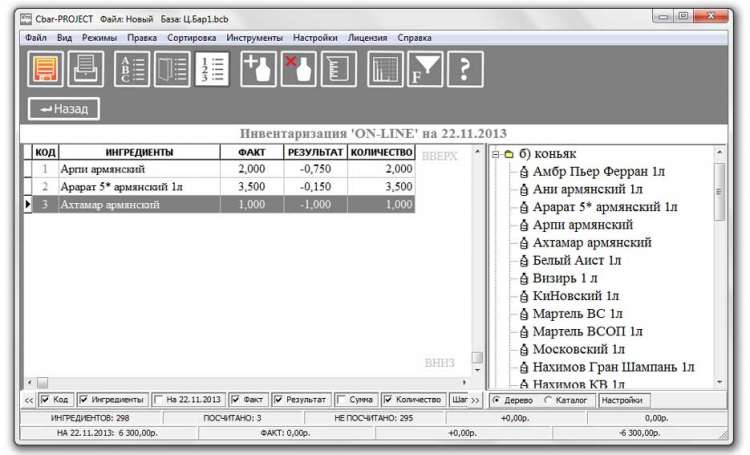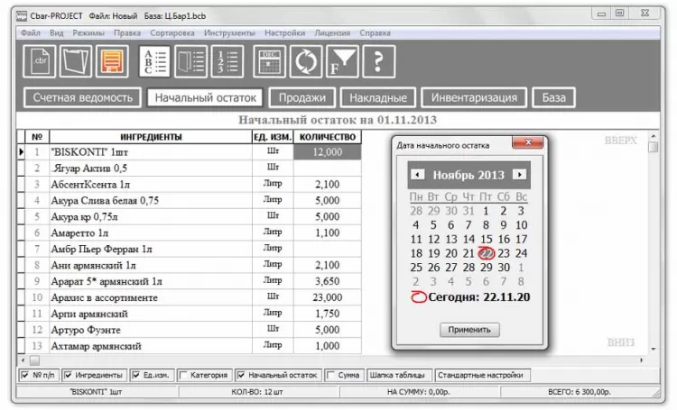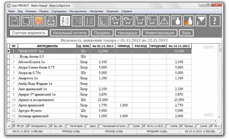 Есть несколько способов выведения бухгалтерского остатка для бармена. Первый способ, самый простой: взять остатки у бухгалтера, при условии, что есть хорошие знакомые или любовные связи в бухгалтерии. Второй способ: зарыться в бумажках, расходниках и накладных, вооружится калькулятором, сделать себе кофе покрепче и считать, считать, и считать. Знаю, что со временем это рутинное занятие доводится до автоматизма и не отнимает уйму времени. Третий способ можно осуществить путем создание таблички в Excel, но от бумажек, калькуляторов и крепкого кофе он все равно не избавит. Ну, и наконец, альтернативный метод: программа Cbar-PROJECT. Эта программа сделана специально для бармена и создавалась она три года в режиме жесткого теста. Суть Cbar’а следующая: программа полностью копирует ваш R-Kepper, а работа на ней напоминает набор большого заказа на сенсоре. Если у вас, есть маленький нетбук или планшет на Windows, то это сто процентное решение проблемы. Кроме того, остаток в этой программе можно вести хоть год, хоть два, хоть десять лет. Здесь можно скачать демо-версию программы Cbar-PROJECT. Это не реклама, это дружеский, профессиональный совет.