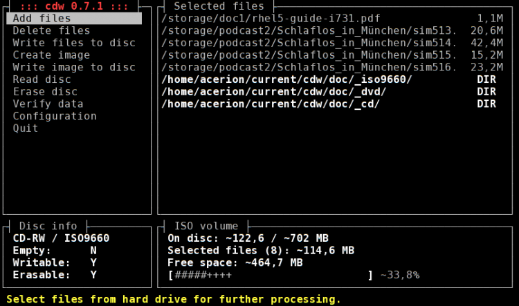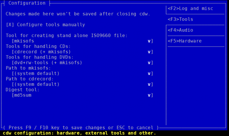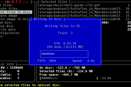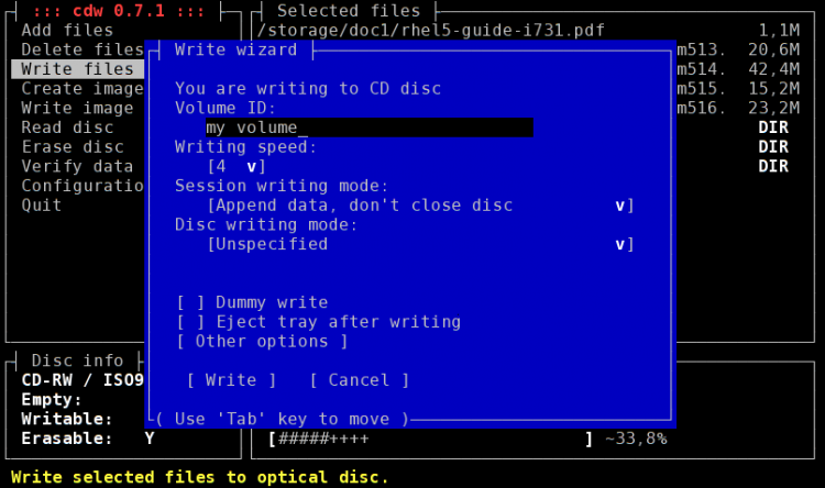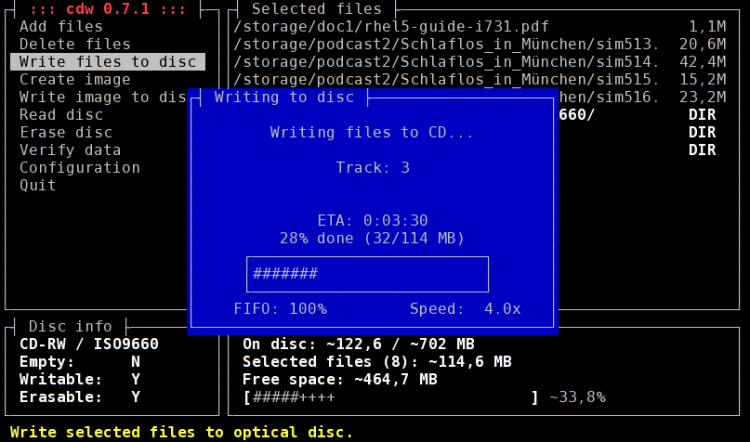 Cdw Псевдографическая оболочка для комплекса консольных утилит: mkisofs/genisoimage, cdrecord/wodim, dvdЇmediainfo, growisofs, xorriso и dvdЇformat, которые предназначены для работы с CD/DVD приводами.