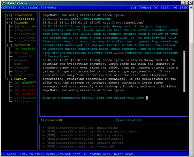 Средство мгновенного обмена сообщениями, поддерживающее протоколы OSCAR (его используют сервисы ICQ и AIM), Yahoo!, IRC, MSN, Gadu-Gadu и XMPP (Jabber). Месседжер использует псевдографическую библиотеку ncurses, что позволяет использовать его удалённо (например через ssh или telnet).
