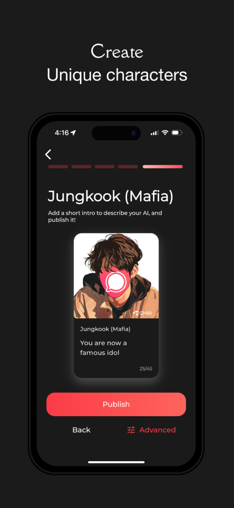 Chai позволяет пользователям создавать собственных персонажей ИИ для персонализированных и увлекательных разговоров, что отличает его от других чат-приложений. Выбирая из различных категорий и определяя уникальные черты личности, пользователи могут создавать ботов, которые отражают их собственные интересы. Передовые технологии, такие как обработка естественного языка и машинное обучение, поддерживают разговоры Chai, обеспечивая естественное взаимодействие, имитирующее человеческий диалог. После завершения создания персонажей, ими можно поделиться в Chai, давая другим участникам и друзьям возможность взаимодействовать с ними.