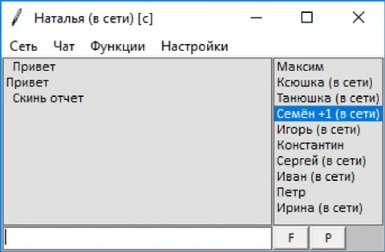 - Для отправки файлов клиенту нажимаем по его нику, перетаскиваем файлы на окно программы и подтверждаем передачу файлов. Получаем уведомления об отправке и доставке файлов. При получении файлов клиент получает уведомление. Для просмотра файлов нажимаем кнопку "ф". Для того чтобы окно программы все время было на переднем плане нажимаем "п".