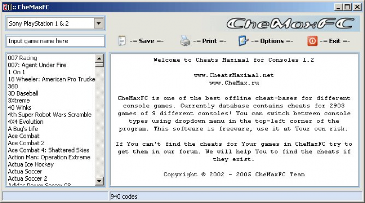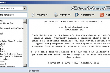 CheMax PC - это база данных с чит кодами для консольных версий игр (для игровых приставок). В ней представлены чит коды для всех известных приставок начиная с 8 битных Nintedo и заканчивая самыми новыми - Sony Playstation Vita, Nintendo Wii U и другими .