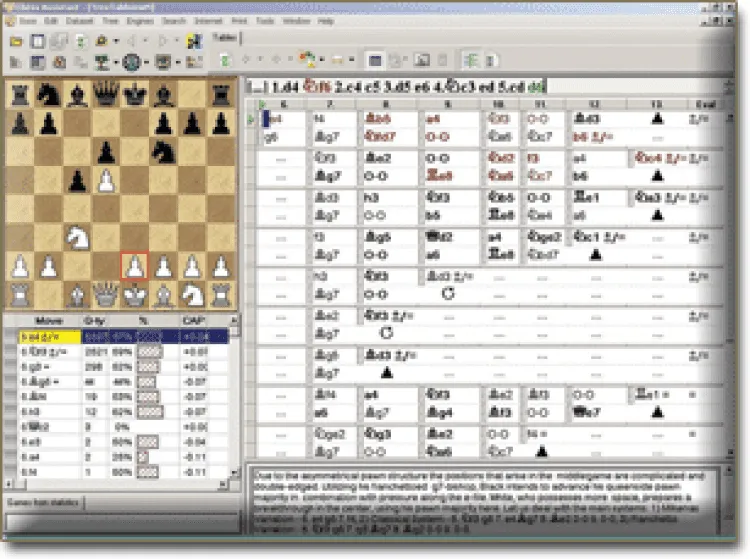 Шахматное дерево показывает в любой дебютной позиции статистику встречаемости и успеха, экспертную и компьютерную оценку. Позволяет в течение нескольких секунд выйти на интересующую позицию, увидеть ее статистику и оценку, а также перейти к партиям, в которой эта позиция встречалась. Поиск новинки/новинок в партии/множестве партий. Автоматический поиск партий-"двойников" внутри одной базы и при сравнении двух баз.
