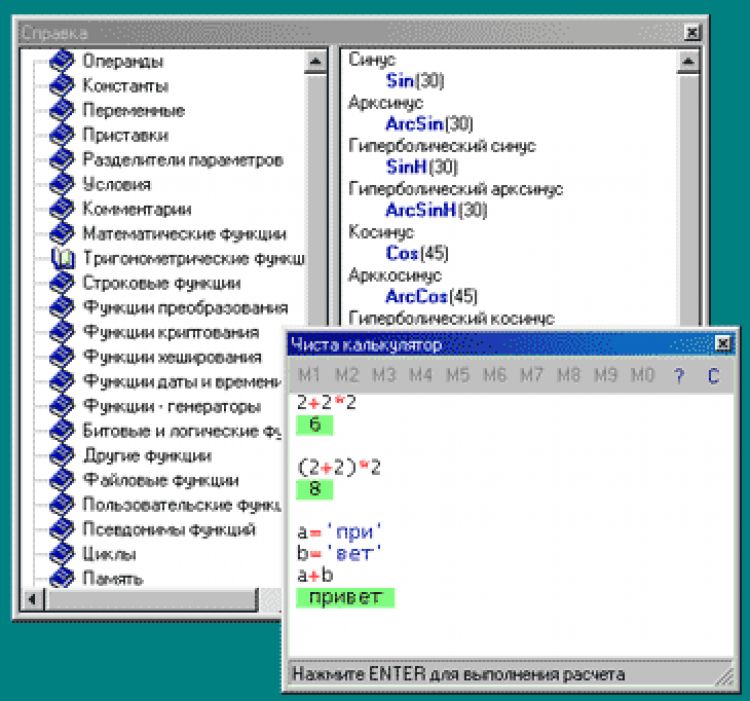Чиста калькулятор это очень простой калькулятор. Более 140 встроенных функций плюс любое количество пользовательских. Назначение псевдонимов функциям. Работа с переменными, с числовыми и строковыми данными, с данными из файлов. Понимает различные системы счисления (включая римские цифры). Поддерживает расчеты в циклах, работает со всеми основными алгоритмами хеширования и криптования. Кроме этого, может сосчитать 2 * 2. ...в общем, ничего лишнего.