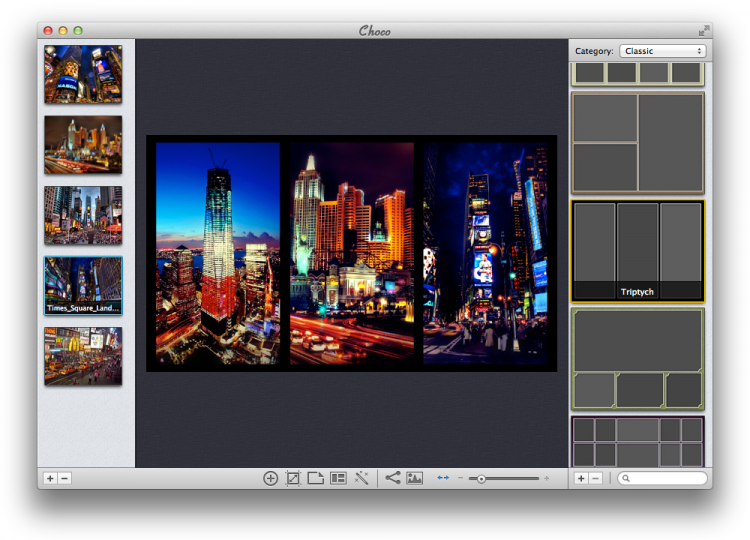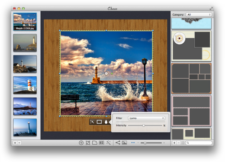 Choco поддерживает огромное колличество графических форматов, включая RAW-формат. А благодаря интеграции в Facebook и Flickr, созданными коллажами можно поделиться с друзьями и со всем миром.