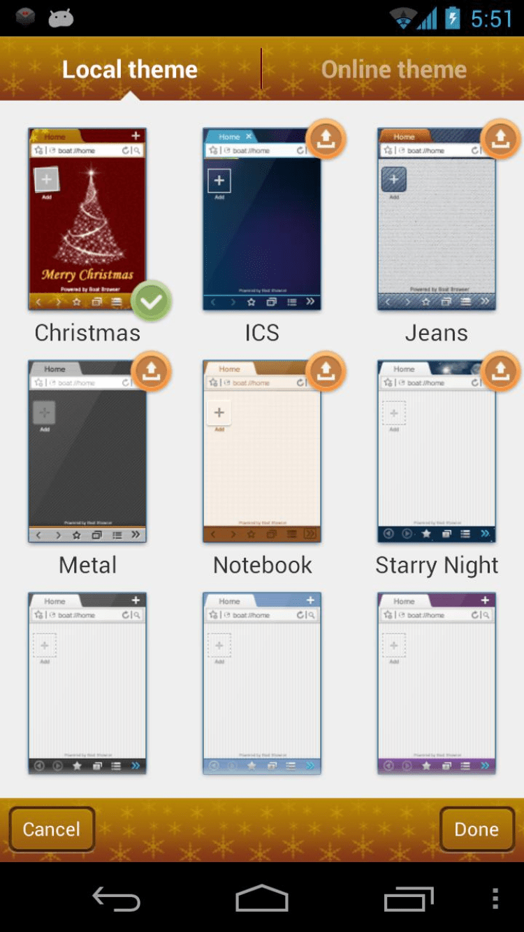Christmas Boat Browser Theme Красивая тема оформления для приложения Boat Browser, выполненная в стиле рождественской елки. Перед установкой этой темы, убедитесь что на вашем устройстве установлен Boat Browser.
