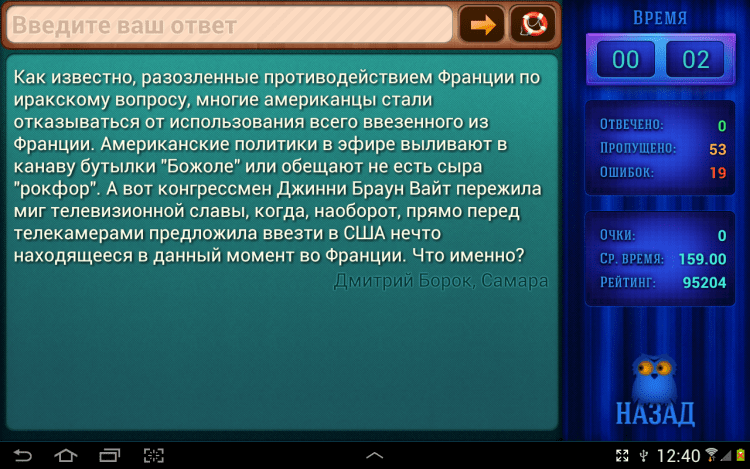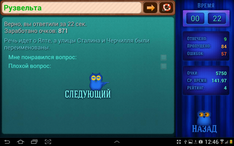 Что? Где? Когда? Викторина — это адаптация одноименной викторины для Android. Отвечая на вопрос, вы зарабатываете очки и поднимаетесь в рейтинге. На каждый вопрос можно получить подсказку. За каждую подсказку количество заработанных очков уменьшается. Вопросы в игре довольно таки сложные. Если вопросы для вас окажутся слишком сложными, вы можете подключить в настройках вопросы из IRC викторин. Они намного проще, но и очков за них дается ощутимо меньше.