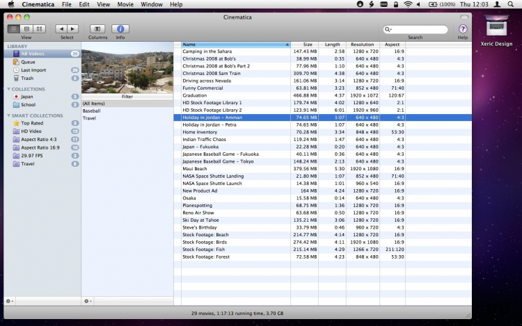 Cinematica Хороший каталогизатор видео коллекции для Mac OS. Cinematica импортирует и каталогизирует видео-файлы в фоновом режиме, и использует "умные" папки для более эффективного разделения видео. С ее помощью можно сортировать файлы и фильтровать их по самым разным критериям, таким как: название, номер сезона или эпизода, авторская студия, жанр, а так же по технических характеристикам: разрешению, соотношению сторон, колличеству кадров в секунду или используемому видео-кодеку.
