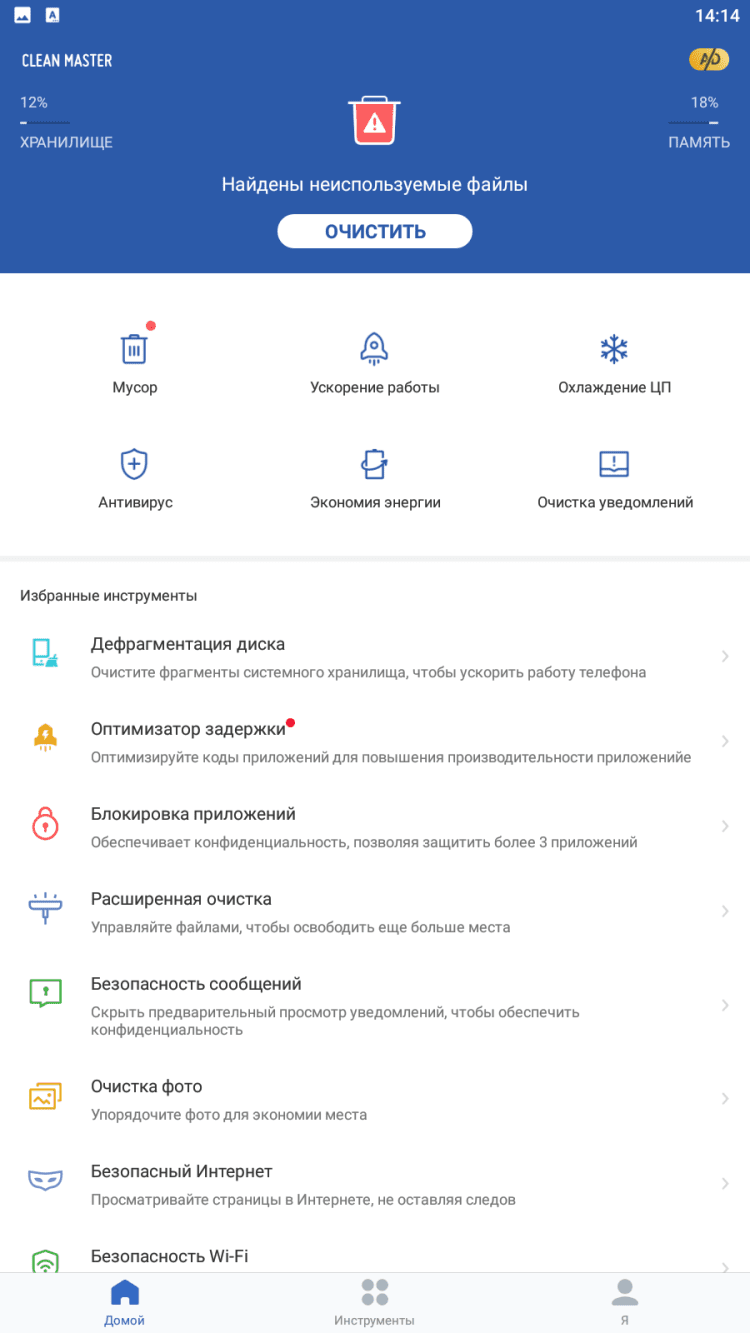 Клин Мастер содержит набор инструментов, с помощью которых можно почистить кэш и истории, а также удалить файлы, которые остались после удаления программ. Это увеличит свободную память и поможет экономить заряд батареи.