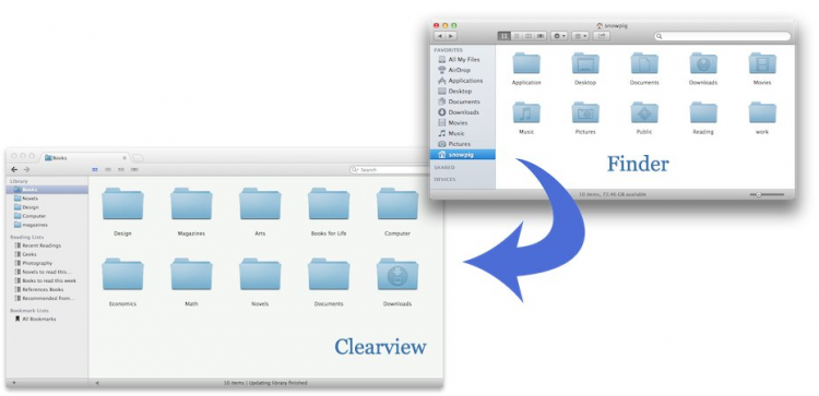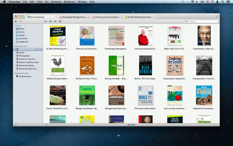 Clearview Программа для удобного чтения электронных книг на вашем Mac. Приложение работает с такими форматами, как PDF, EPUB, CHM, и MOBI. В процессе чтения вы можете добавлять аннотации, ставить закладки и использовать поиск по тексту. Чтобы добавить книги в вашу библиотеку - просто перетащите содержащую их папку в окно программы.