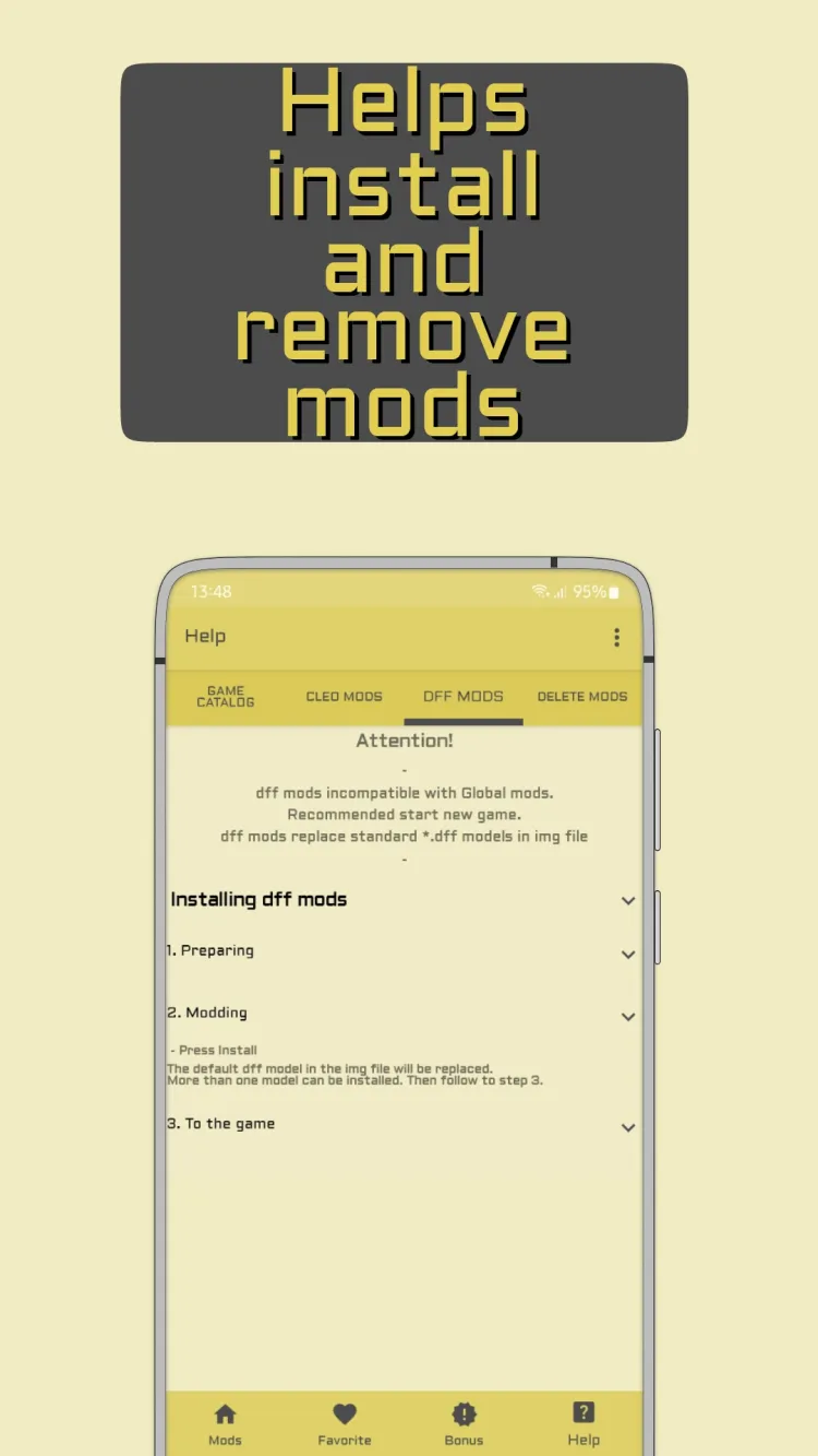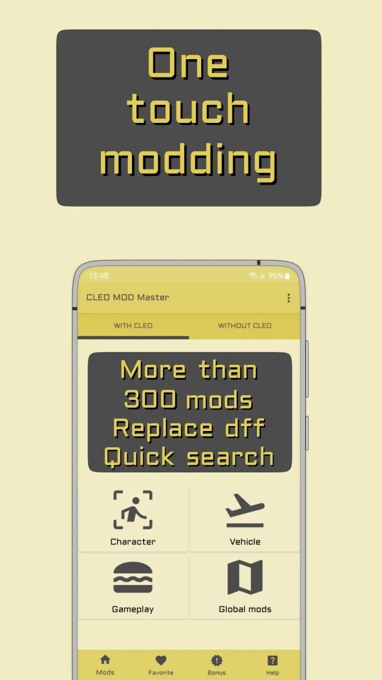 Моды GTA — это далеко не новое явление и опытные геймеры ранее успешно находили их в Интернете. Но благодаря этому приложению, вам больше не придется тратить время на поиски. Весь необходимый вам контент доступен в этом простом в использовании приложении, абсолютно бесплатно. CLEO MOD Master предлагает обширную библиотеку модов, которая содержит различные улучшения для транспортных средств, элементов интерфейса, оружия, погодных условий и многого другого. Каждый мод можно установить в пару нажатий, не выходя из приложения. А когда моды вам надоедят, приложение поможет вам стереть весь дополнительный контент одним нажатием.