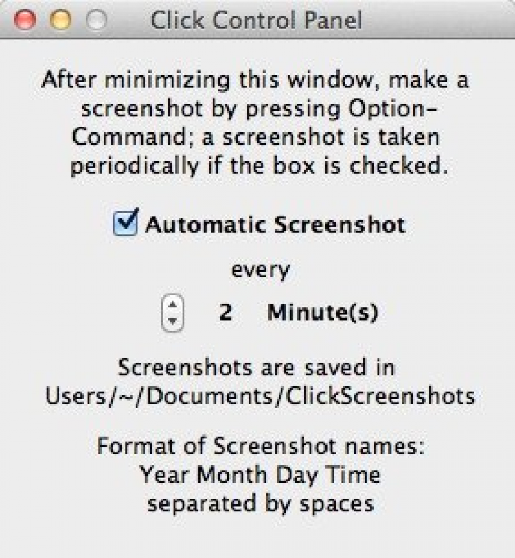 Click Программа, предназначенная для создания скриншотов. Обычные программы не могут делать скриншоты в некоторых ситуациях, например, во время просмотра DVD фильма, но для Click это не проблема. Вы можете самостоятельно делать снимки, или настроить съемку автоматически, с интервалом от 1 до 60 минут.