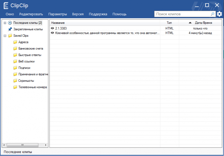 ClipClip - очередной менеджер буфера обмена, который может сохранять текст, изображения и прочие файлы на жескткий диск или в Dropbox. Программа доступна всем пользователям бесплатно. Ключевой особенностью данной программы является то, что она автоматически группирует все по категориям (адреса, быстрые ответы, ссылки и пр.). Она проста в использовании и имеет понятный интерфейс, который переведен на русский язык.