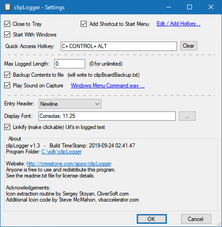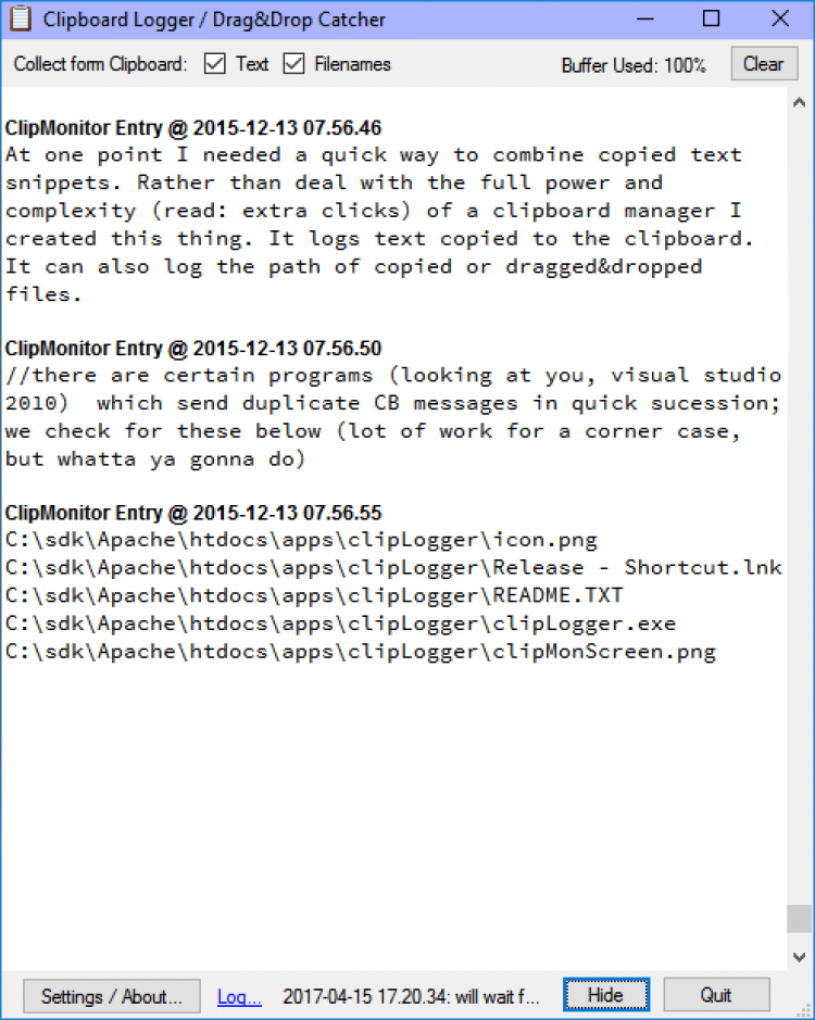 clipLogger небольшая бесплатная утилита для Windows, которая следит за буфером обмена Windows, и сохраняет из него весь текст в отдельный "ящик". Сохраненный текст может быть разделен временными метками и ярлыками, или же просто сохраняться как есть. Кроме текста, утилита также может выхватывать пути скопированных или перетащенных файлов.