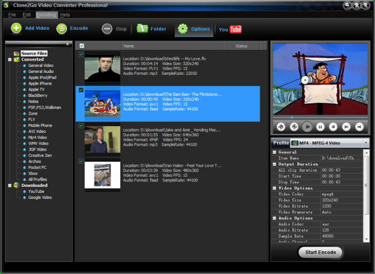 Clone2go Video Converter — это мощный универсальный конвертер видео файлов, поддерживающий все распространенные форматы и позволяющий подготавливать видео к просмотру на различных мобильных устройствах. Так же с его помощью можно загружать видео-ролики с YouTube и конвертировать их.