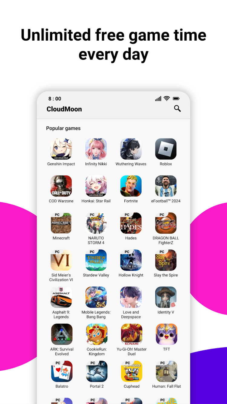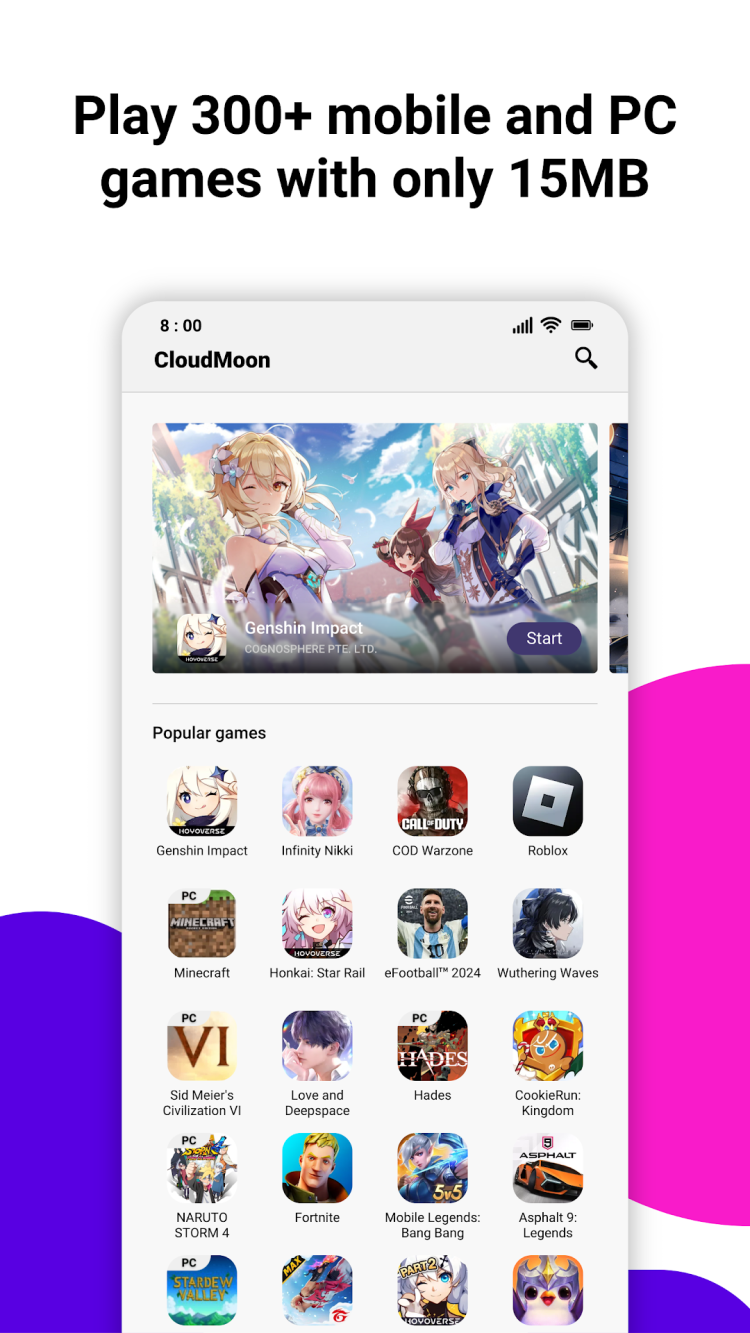 Последняя версия CloudMoon содержит более 300 игр на выбор. В этот список входят Genshin Impact, Fortnite, Civilization VI и многие другие. Для игры в любую из них не потребуется дополнительное место на вашем гаджете. Просто выберите нужную игру и наслаждайтесь. Важно, что приложение предоставляет неограниченное игровое время каждый день, так что вы можете играть столько, сколько захотите.