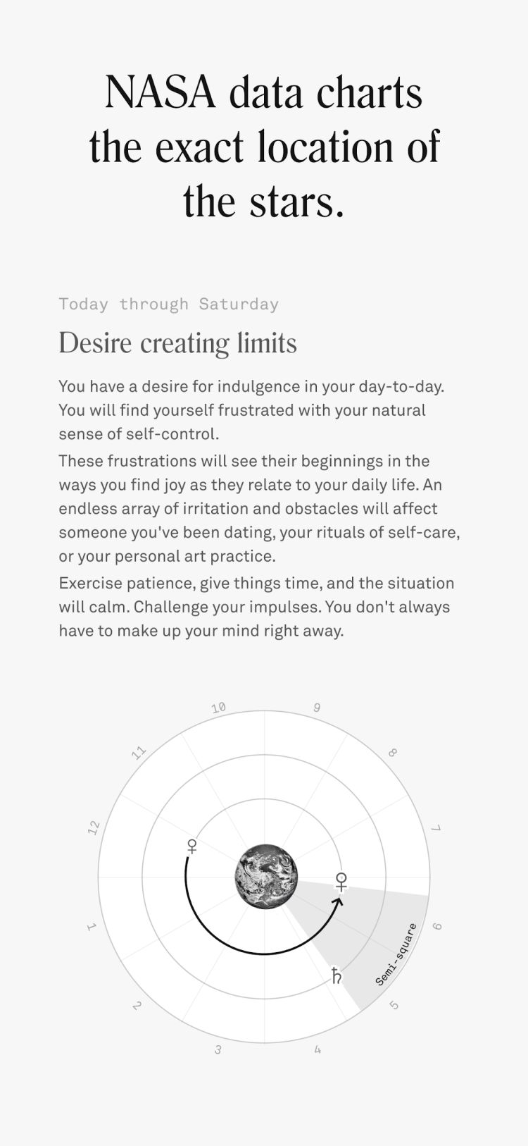 Co–Star Personalized Astrology — это мобильное приложение, которое выделяется на переполненном рынке программного обеспечения для астрологии, используя научные данные. Оно использует точную информацию, предоставленную NASA, чтобы гарантировать точные астрологические показания для любого человека.