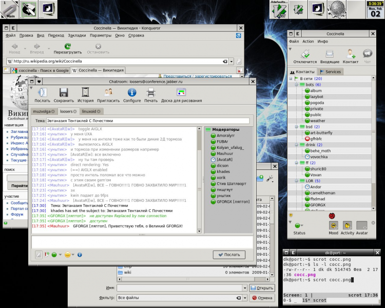 Coccinella для Linux - это мессенджер, который позволит обменивать не только текстовыми сообщениями, но и рисунками, которые можно создавать во встроенном редакторе. Так же в программе есть возможность голосовой связи, конференц-связи, функция отправки файлов другим пользователям и поддержка статусов.