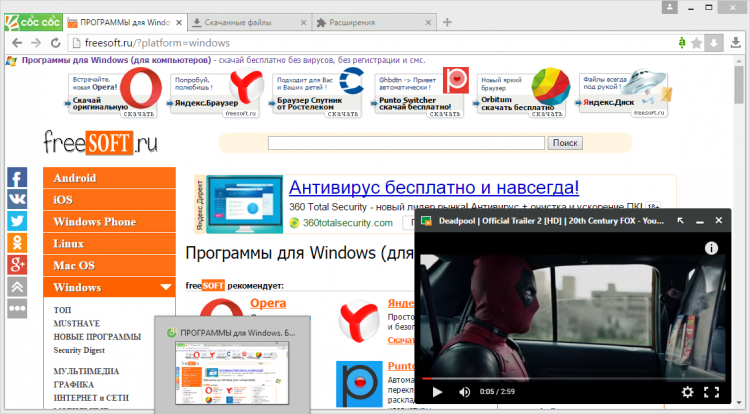 Во-первых, CocCoc Browser умеет качать торренты. Так что надобность в отдельном торрент-клиенте с этим браузером отпадает. Во-вторых, браузер может перехватывать и сохранять на компьютер потоковое видео с веб-сайтов. Кроме этого, он может вынести видео в отдельное окошко, которое можно расположить в любой части экрана и продолжать просмотр работая с другими вкладками. В-третьих, браузер может обходить блокировку сайтов, в частности Facebook.