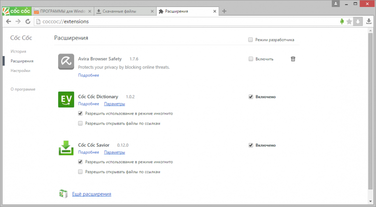 В остальном CocCoc Browser предлагает все те же функции и возможности, что и Google Chrome: