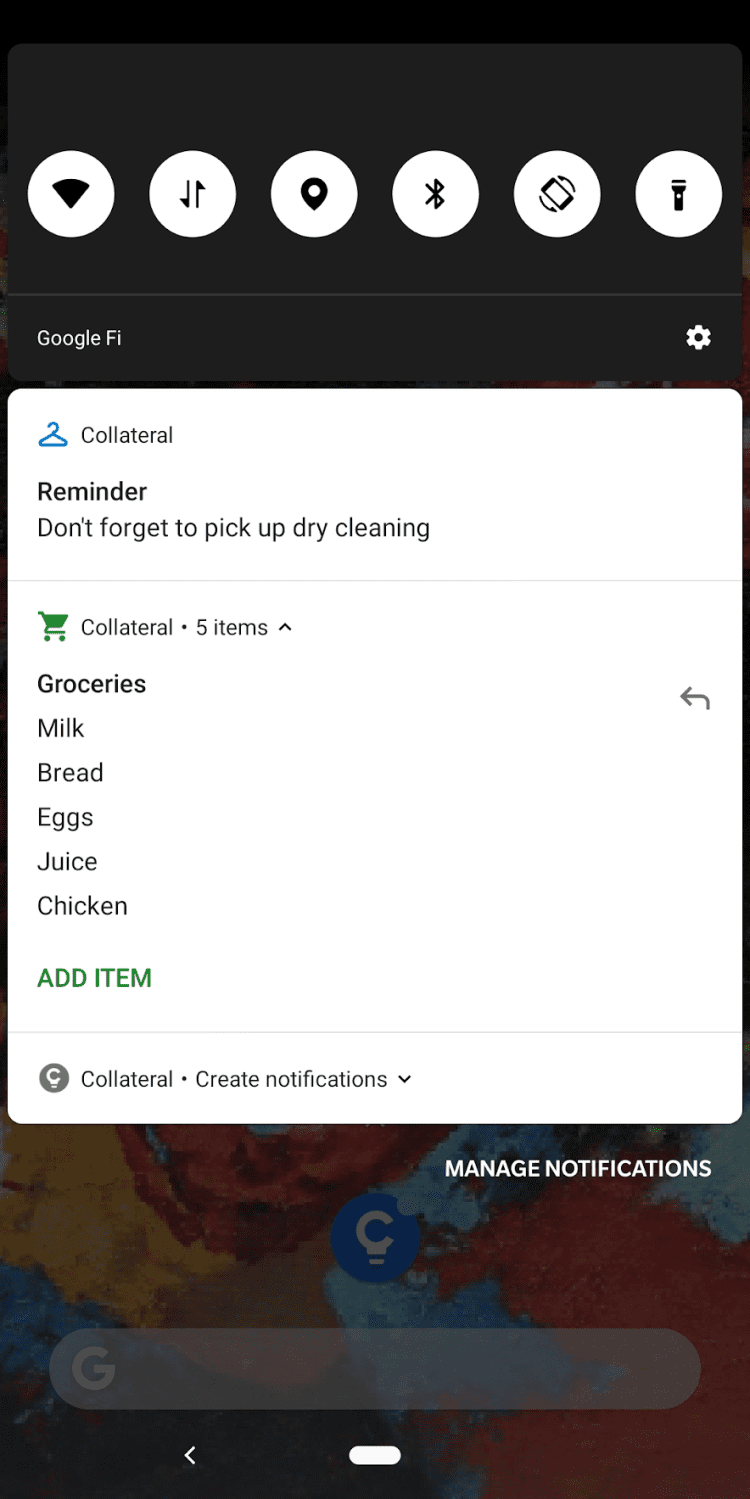 Collateral Программа, которая позволит вам создавать заметки и списки, которые будут отображаться в панели уведомлений вашего устройства. Таким образом, вы будете видеть список запланированных дел, покупок или многого другого, каждый раз, беря в руки свое устройство. Приятной особенностью программы Collateral является возможность добавления иконок к каждой заметке.