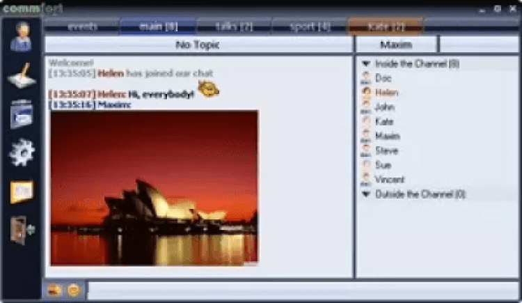 CommFort - это многофункциональная клиент-серверная программа, позволяющая обеспечить все виды коммуникаций в сети: общение в каналах, обмен сообщениями, аудио- и видеосвязь, обмен файлами и папками. CommFort обладает простым, удобным, понятным любому пользователю интерфейсом. CommFort одинаково подходит как для небольших сетей, состоящих из единиц или десятков пользователей, так и для крупных сетей, объединяющих тысячи ПК. 2000 символов: CommFort - многофункциональная клиент-серверная программа, позволяющая обеспечить все виды коммуникаций в сети: общение в каналах, обмен сообщениями, аудио- и видеосвязь с поддержкой конференций, обмен файлами и папками. CommFort обладает простым, удобным, понятным любому пользователю интерфейсом. CommFort одинаково подходит как для небольших сетей, состоящих из единиц или десятков пользователей, так и для крупных сетей, объединяющих тысячи ПК. Предусмотрена система администрирования с разделением прав, автоматической фильтрацией плохих слов и защитой от флуда. CommFort максимально эффективно использует ресурсы сети: передача файлов, а так же аудио- и видеосвязь работают между клиентами напрямую, минуя сервер.