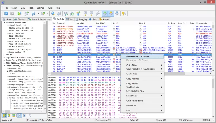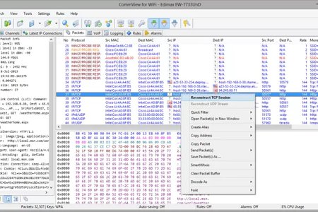 С помощью CommView for WiFi вы можете видеть список сетевых соединений, IP-статистику и исследовать отдельные пакеты. Пакеты можно дешифровать с использованием пользовательских ключей WEP или WPA-PSK и декодировать вплоть до самого низкого уровня с полным анализом распространенных протоколов. Предоставляется полный доступ к необработанным данным. Перехваченные пакеты могут быть сохранены в файл для последующего анализа. Гибкая система фильтров позволяет отбрасывать ненужные вам пакеты или перехватывать только те пакеты, которые вы захотите. Настраиваемые предупреждения позволяют сообщать пользователю о важных событиях, таких как подозрительные пакеты, высокая загрузка сети или неизвестные адреса. Для редактирования и передачи пакетов через адаптер беспроводной связи можно использовать Генератор пакетов.