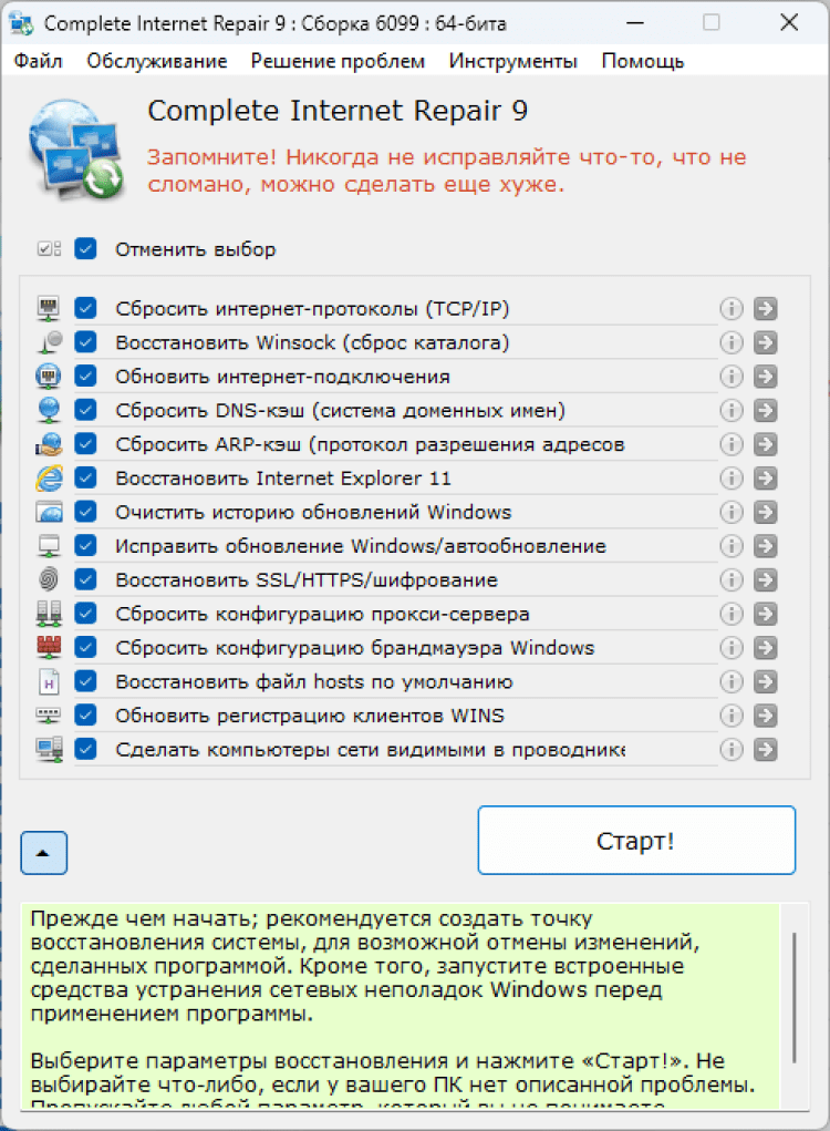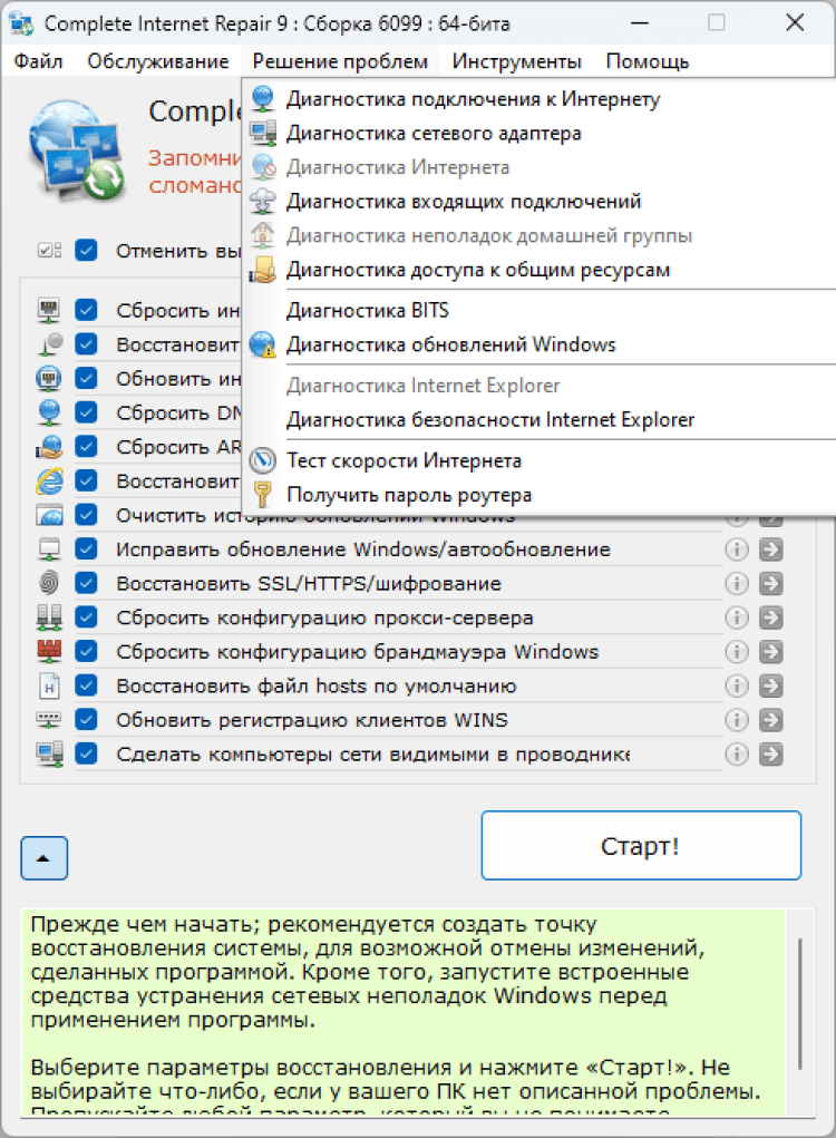 Complete Internet Repair предлагает широкий спектр функций для диагностики и восстановления интернет-соединения: