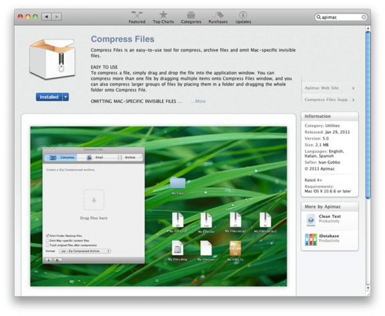 Compress Files Программа для сжатия, архивирования и шифрования файлов. Данная программа не пропускает скрытые системные файлы Mac в архивы, таким образом они не будут мешать при переносе архива на другую платформу. Для того, чтобы сжать файл, достаточно просто перетащить его в окно программы. Можно также сжимать сразу по нескольку файлов, перетащив их вместе, либо перетащить всю папку, содержащую их, в окно программы.