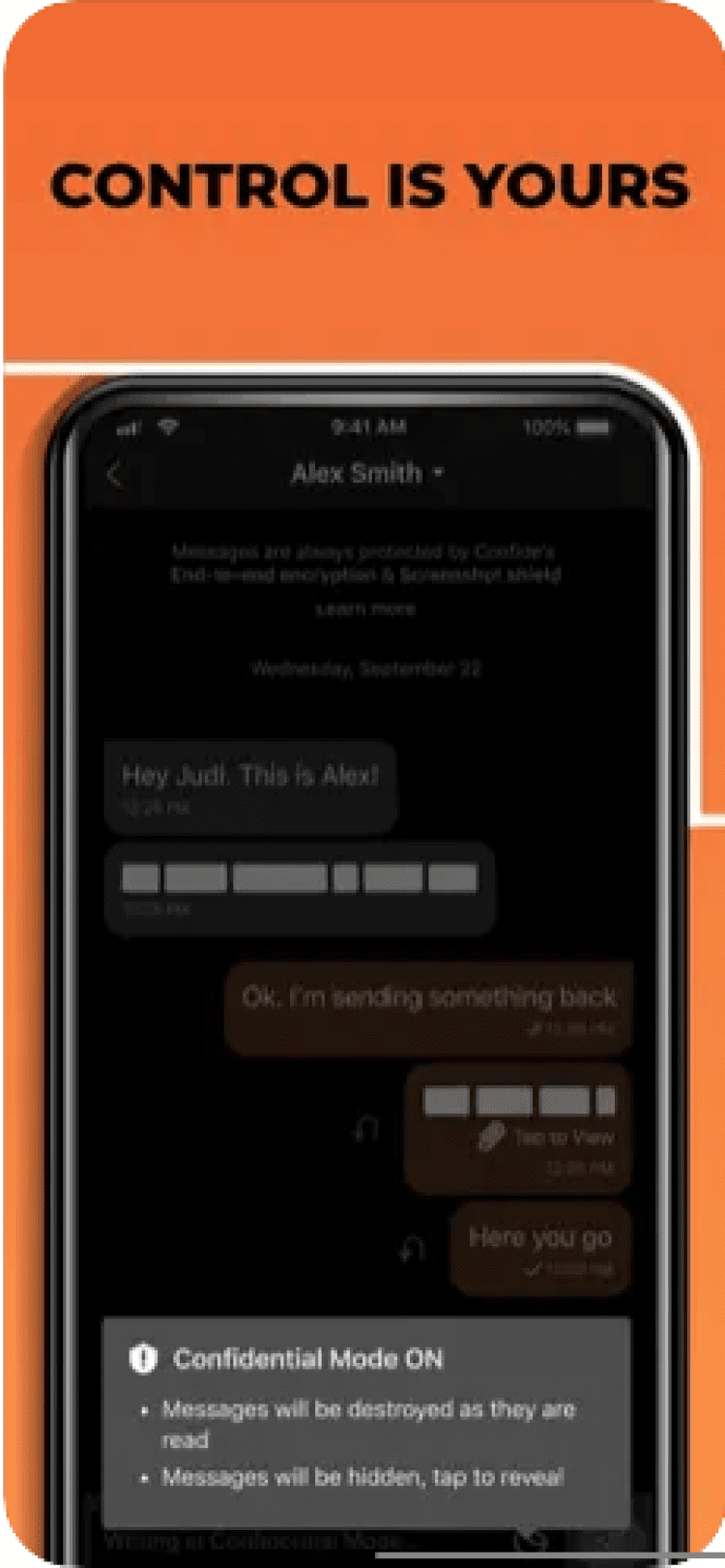 Программа для обмена конфиденциальными сообщениями для мобильных устройств iOS. Confide обладает защитой от создания скриншотов и удаляет сообщения сразу же, после прочтения, без возможности восстановления. Так же, Confide позволит отправлять сообщения на любой адрес электронной почты или на номер телефона, уведомляя вас о прочтении сообщения получателем.