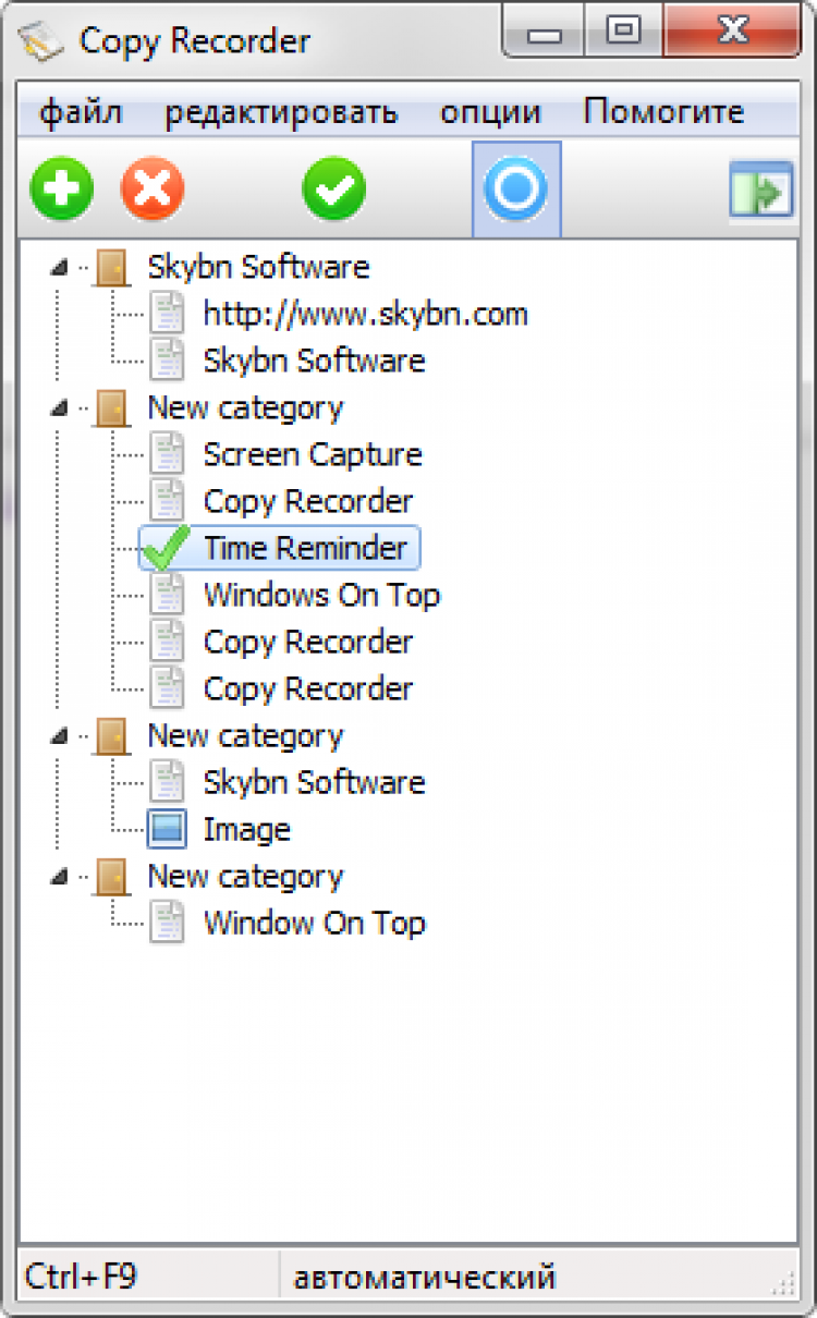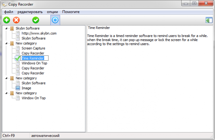 Copy Recorder позволяет создавать категории для того, чтобы упорядочить сохраненные записи, редактировать описания записей для облегчения поиска и навигации, и очищать историю нажатием одной кнопки. При закрытии программы, все накопленные за сеанс работы записи сохраняются и остаются доступны даже после выключения компьютера.