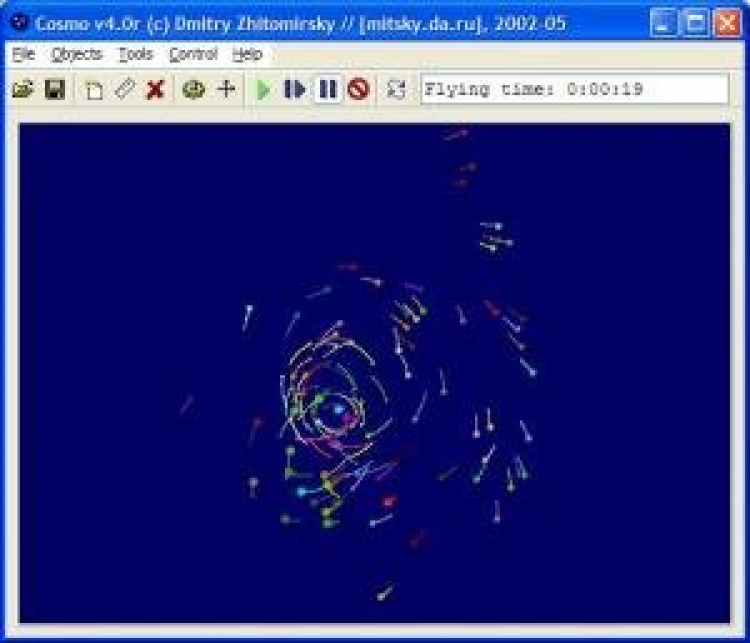 Cosmo v4.3 Рисует движение тел под действием сил гравитации. Позволяет наглядно и на конкретных цифрах увидеть, как это работает. Программа настроена на работу только с одним движущимся объектом, сделано это было из довольно загадочных соображений, несвязанных с упрощением задачи.