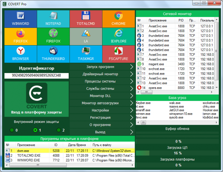 COVERT Pro USB -это все действия пользователя на компьютере маскируются от перехвата клавиатурного ввода и считывания изображений экрана монитора. Не важно, в каком состоянии компьютер — есть ли на нем вирусы и шпионы. Не важно, есть ли понимание принципов работы операционной системы у пользователя. Важно, что ваша работа за компьютером становится невидимой для шпионов. Функционал программы имеет большое количество мониторов для глубокого анализа и контроля операционной системы.