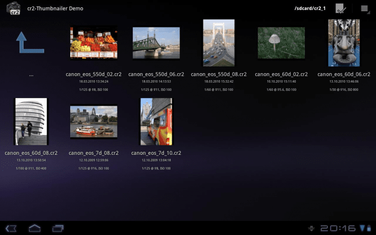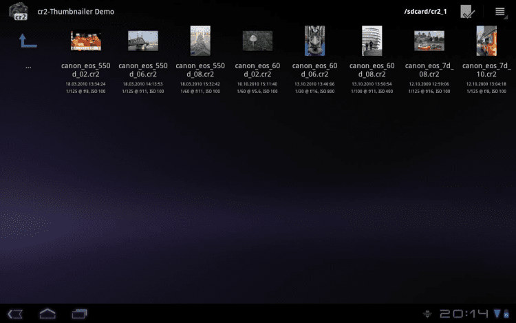 cr2-Thumbnailer Demo Приложение для просмотра превью DSLR RAW файлов фотоаппаратов Canon. Просматривайте фотографии, делитесь понравившимися и сохраняйте их в формате jpeg. Вы можете вручную установить размер превью для фотографий, а в полноэкранном режиме просмотреть EXIF-данные снимка. Работает только с файлами формата CR2.