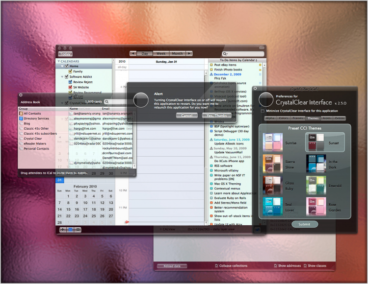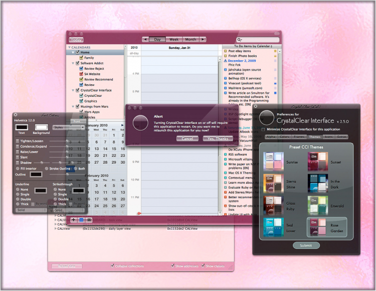 CrystalClear Interface Позволит вам изменять прозрачность, цвет и стиль окна приложения. Оно содержит альтернативный набор кнопок для замены стандартных, а так же большой набор иконок на ваш выбор. CrystalClear Interface уже есть 8 готовых вариантов оформления.Вы можете применить любой из них, или даже смешать несеколько в один.