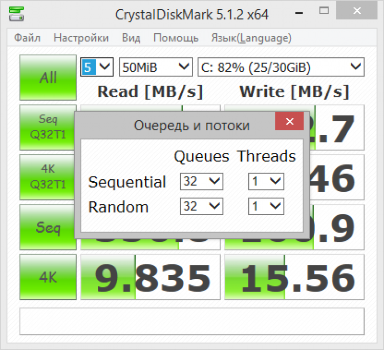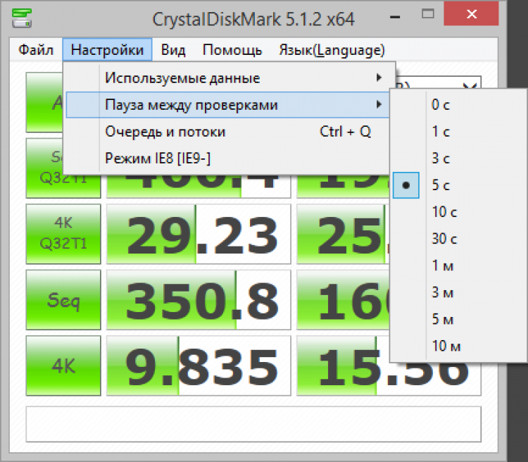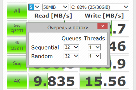 CrystalDiskMark - это полезная программа. В меню настроек программы можно выбрать тип используемых данных (случайные или нули), интервал между проверками и настроить размер очереди и количество потоков для случайного и последовательного чтения/записи.