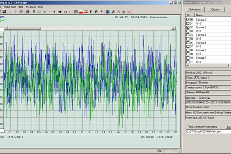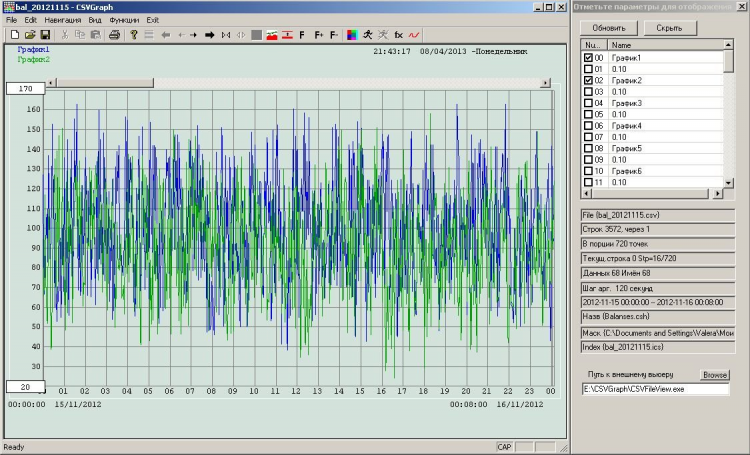 CSVGraph.exe - это программа решает задачу просмотра по частям больших многомегабайтных числовых csv-файлов с функциями одного переменного (2D-графики). Она позволяет листать (скользить) по графику и уменьшать или увеличивать масштаб. Кроме того, она позволяет при одном столбце аргумента иметь в CSV множество параллельно отображаемых по выбору из списка столбцов. Выбор графиков выполняется пометкой на чекбоксах.
