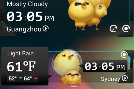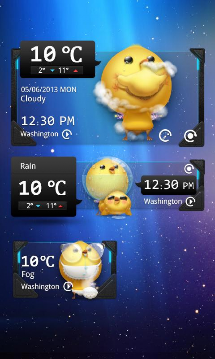 Cute Chicken Reward Theme Тема оформления для приложения GO Weather EX, все иконки в которой стилизованы под прикольных цыплят. Имеет специальное оформление для 7 погодных условий: солнце, дождь, снег, гром, облака, пасмурная погода, туман.