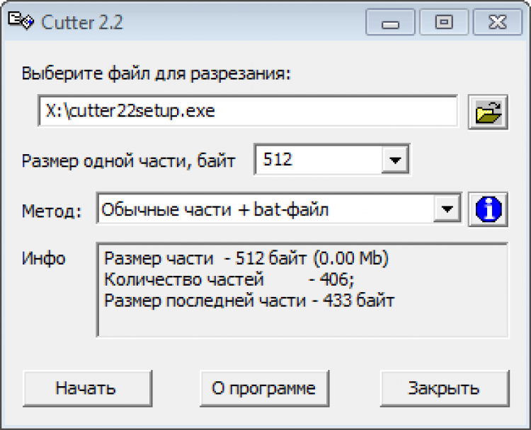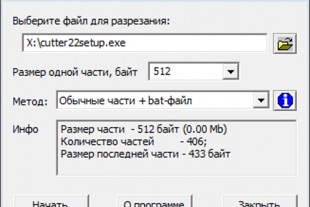 Cutter позволяет разбивать файл на обычные части или самосклеивающиеся. В опциях можно указать размер части файла, а программа покажет на сколько частей будет разделен тогда файл и средний размер каждой части.