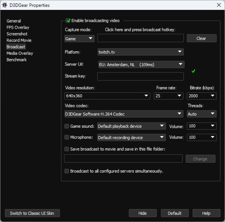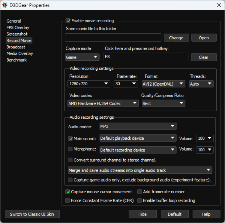 D3DGear предоставляет гибкие настройки качества для видео роликов. Можно выбрать фреймрейт, разрешение и пр. Ролики сохраняются в формате AVI.