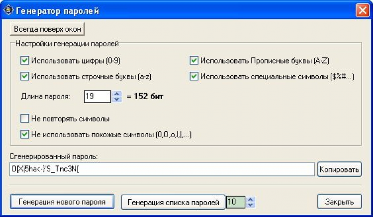 - Наличие встроенного в программу генератора уникальных паролей и списка паролей (встроенный генератор списка паролей позволяет одним нажатием сгенерировать список уникальных паролей для использования внутри программы).
