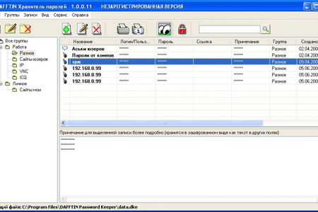 DAFFTIN Password Keeper - это программа для хранения различных логинов и паролей. Количестко интернет сайтов постоянно растет и все они требуют зарегистрироваться, требуют новых учетных записей, которые нужно где-то безопасно хранить, а вам надоело записывать эту информацию на клочках бумаги или в блокноте? Или, быть может, вы системный администратор и у вас большое количество паролей и учетных записей ваших пользователей, которые должны быть отсортированы по группам и доступны только вам? Если вы не знаете где хранить номера банковских карт и вообще любую конфедициальную текстовую информацию, к которой в любой момент времени вы могли бы получить быстрый безопасный доступ, то программа DAFFTIN Password Keeper именно то, что вам нужно!