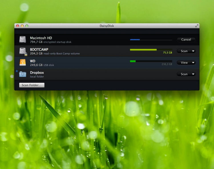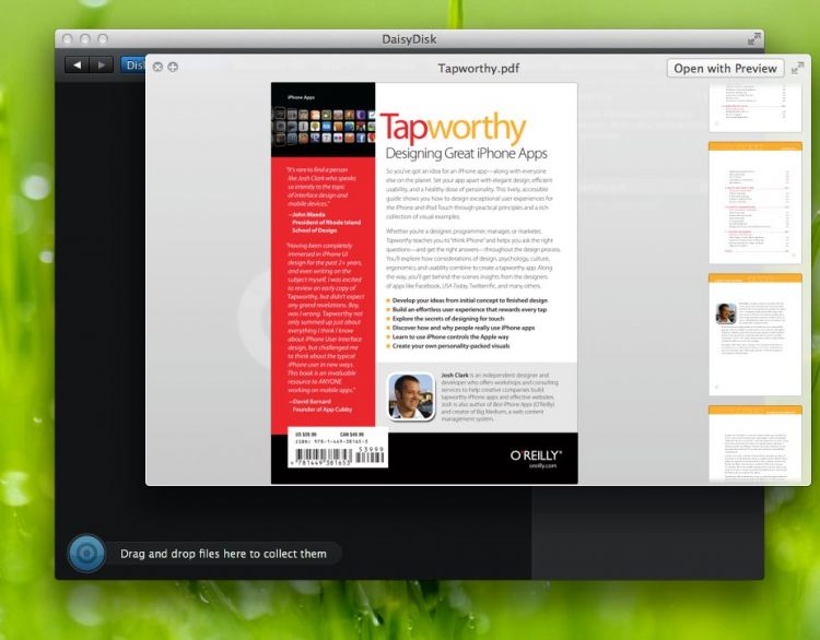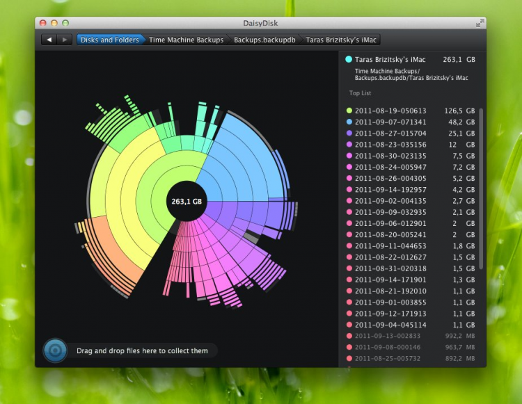 DaisyDisk - данное приложение позволяет просканировать подключенные диски и вывести секторную диаграмму файловой системы. На диаграмме будут показаны все папки, содержащиеся на жестком диске. Чем больше места занимает папка, тем больше размер ее сектора. Это позволит легко и быстро понять что и сколько место занимает. Проводя курсором по диаграмме вы сможете посмотреть путь каждого файла и просмотреть содержимое папок.