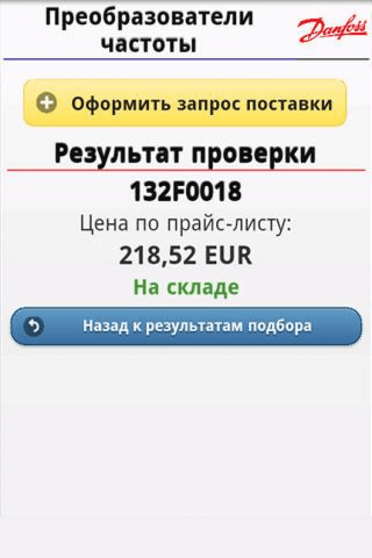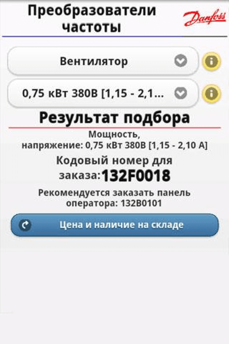 Данфос FCC Программа позволяет в два шага подобрать преобразователи частоты для таких простых применений как: вентилятор, дымосос, центробежный насос, поршневой насос, винтовой компрессор, поршневой компрессор. Вам необходимо только выбрать тип применения и указать Ток/Напряжение/Мощность вашего двигателя. При помощи программы можно получить заказной код преобразователя частоты, его розничную цену и узнать наличие выбранного оборудования на складе в Москве.