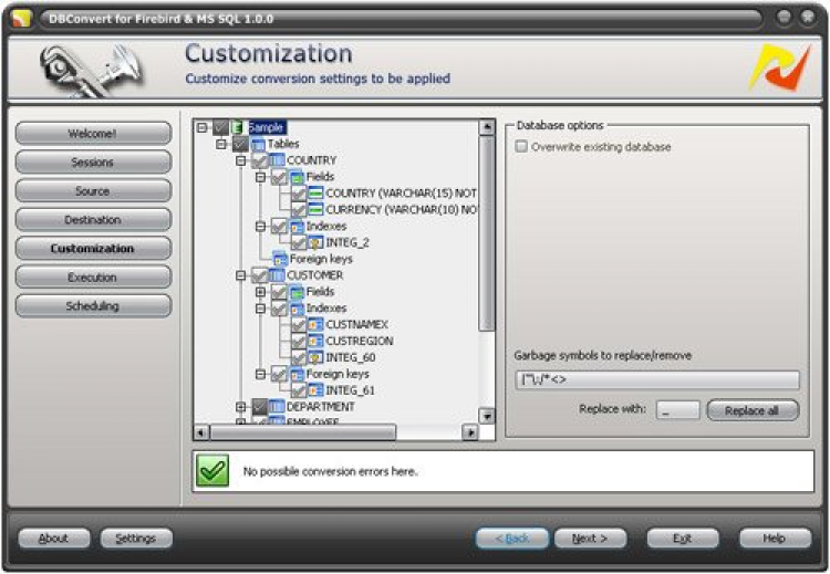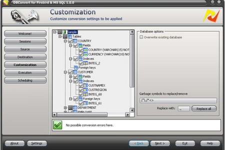 DBConvert для Firebird и MS SQL имеет множество функций, таких как интерактивный режим /режим командной строки, сохранение данных в MS SQL дампе, планировщик задач, функция отображения данных, фильтрация данных, предварительная проверка возможных ошибок, и т.д.