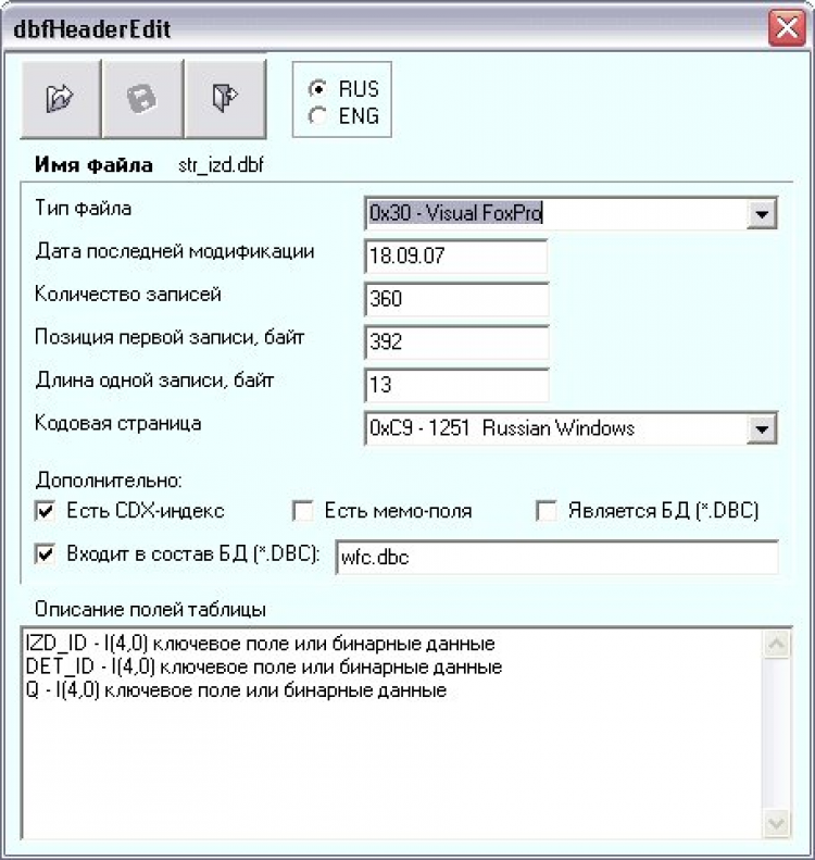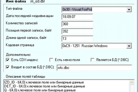 dbfHeaderEdit Программа dbfHeaderEdit (редактор заголовков dbf-таблиц) предназначена для просмотра и изменения заголовков файлов формата DBF. Такое редактирование зачастую требуется при восстановлении испорченных таблиц данного формата. Применение для этих целей шестнадцатеричного редактора неудобно, так как требует подробных знаний о структуре заголовка и о значении используемых в нем кодов. В программе dbfHeaderEdit вся необходимая информация представляется в удобном для понимания и редактирования виде.