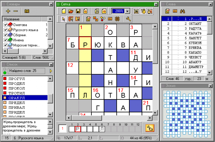 Decalion - это программа для составления и оформления кроссвордов. 70000 слов в толковых и тематических словарях. Редактирование слов и определений. Создание пользовательских словарей. Поддержка национальных алфавитов. Быстрый поиск. Различные стили оформления. Вставка изображений и текстур. Экспорт графики и текста. Система контроля и статистики. Независимость от средств управления базами данных, реестра Windows.