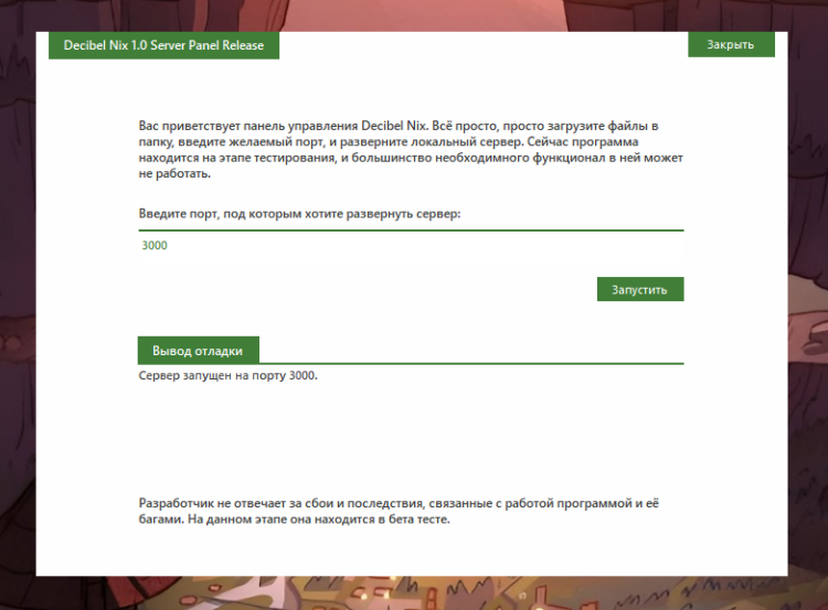 Decibel Nix — простейший веб-сервер, движок, который позволяет развернуть ваши сайты в локальной сети. Вы можете выбрать необходимый порт, и сайты сразу же будут доступны. Также доступна функция работы с PHP, но пока что без сессий и баз данных.